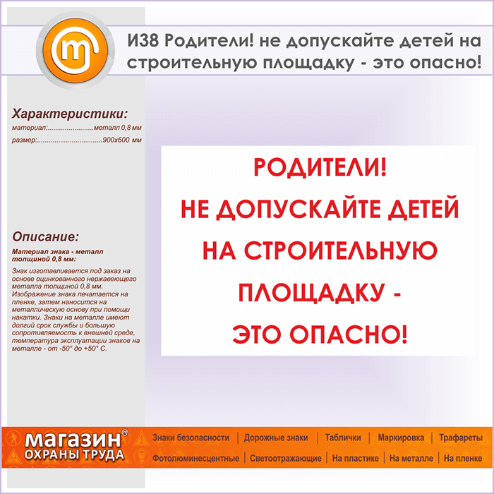 Знак «Родители! не допускайте детей на строительную площадку - это опасно!», И38 (металл, 900х600 мм) в Кашире купить