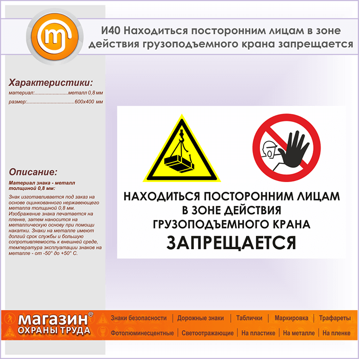Знак «Находиться посторонним лицам в зоне действия грузоподъемного крана запрещается», И40 (металл, 600х400 мм) в Кашире купить