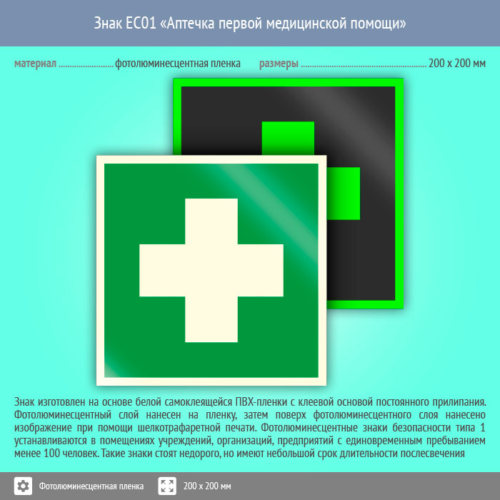Знак EC01 «Аптечка первой медицинской помощи» (фотолюминесцентная пленка, 200х200 мм) в Кашире купить