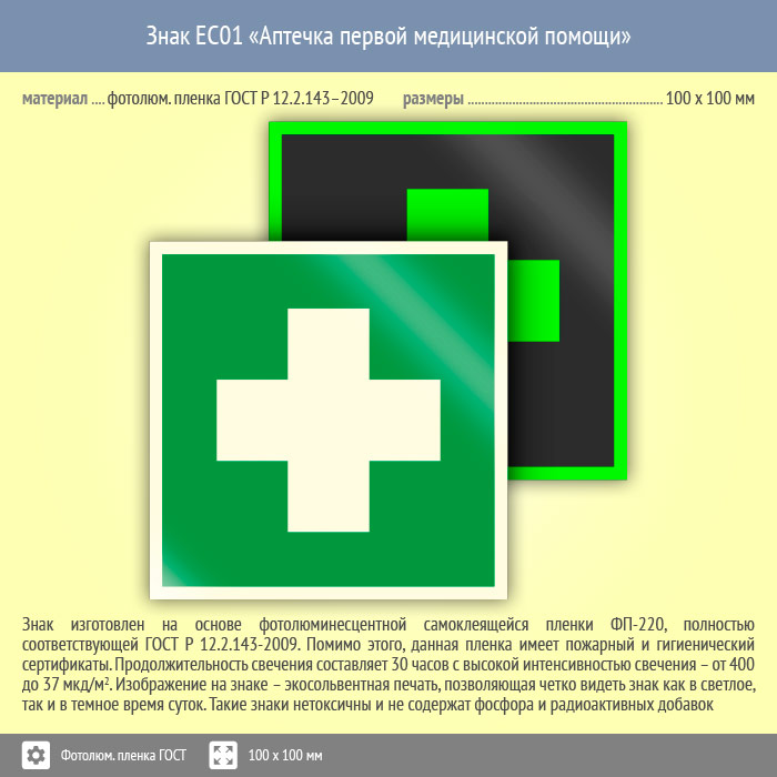 Знак EC01 «Аптечка первой медицинской помощи» (фотолюминесцентная пленка ГОСТ 34428-2018, 100х100 мм) в Кашире купить