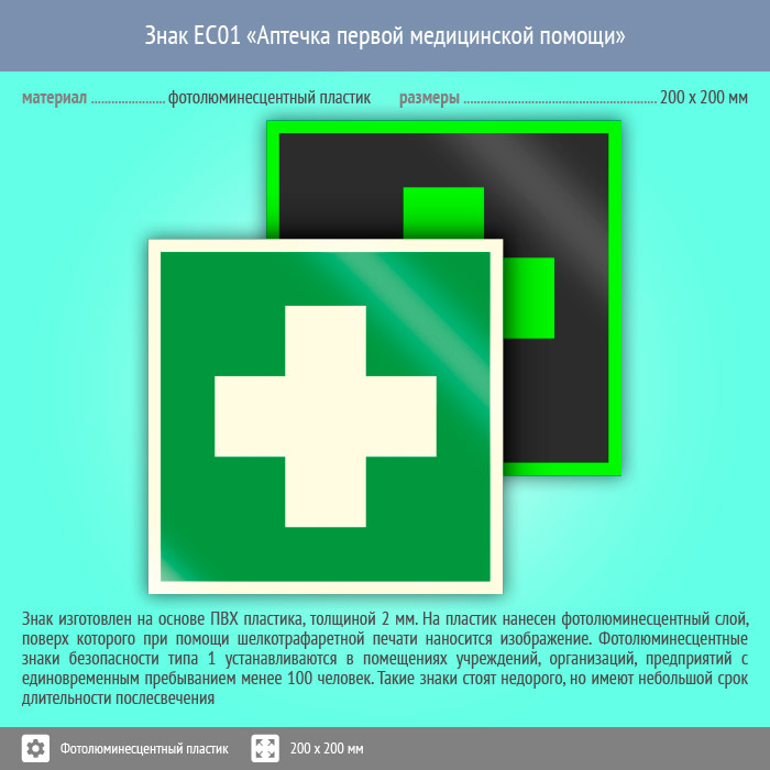 Знак EC01 «Аптечка первой медицинской помощи» (фотолюминесцентный пластик, 200х200 мм) в Кашире купить