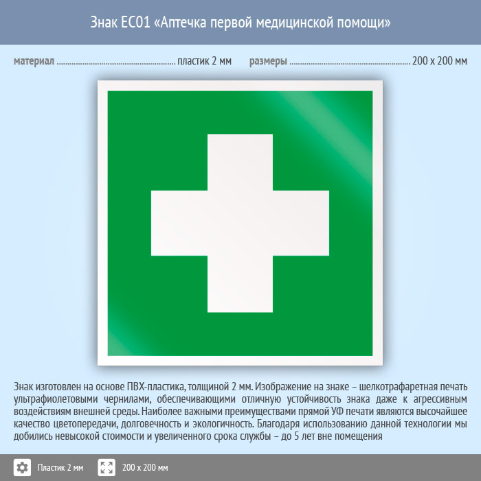 Знак EC01 «Аптечка первой медицинской помощи» (пластик, 200х200 мм) в Кашире купить