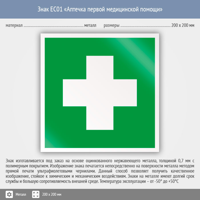 Знак EC01 «Аптечка первой медицинской помощи» (металл, 200х200 мм) в Кашире купить
