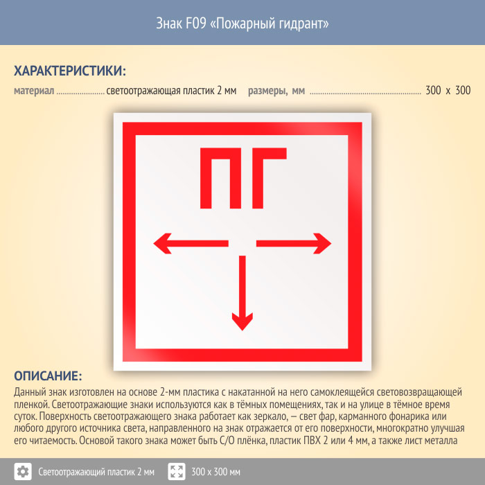 Знак F09 «Пожарный гидрант» (светоотражающий пластик, 300х300 мм) в Кашире купить