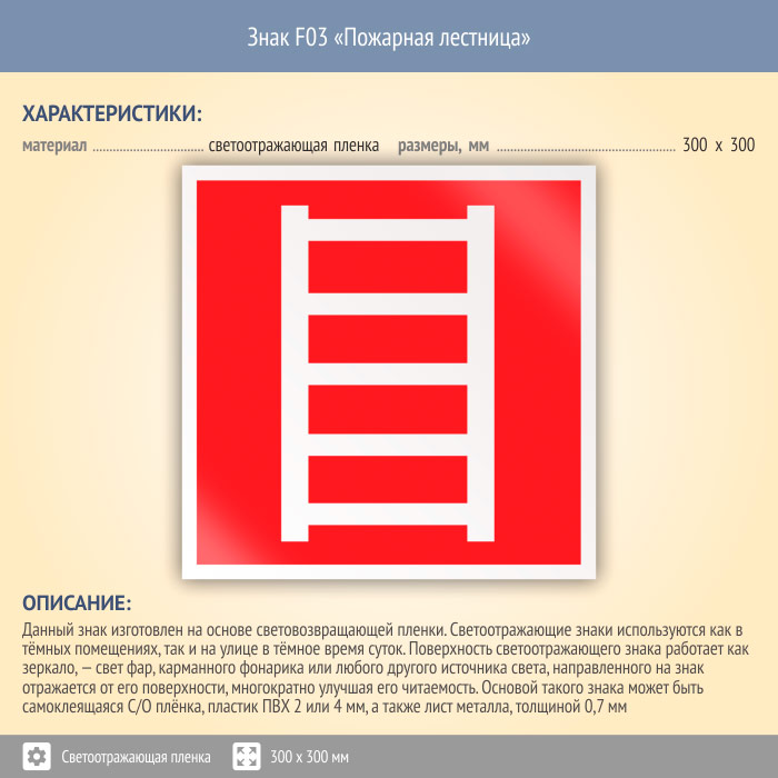 Знак F03 «Пожарная лестница» (светоотражающая пленка, 300х300 мм) в Кашире купить