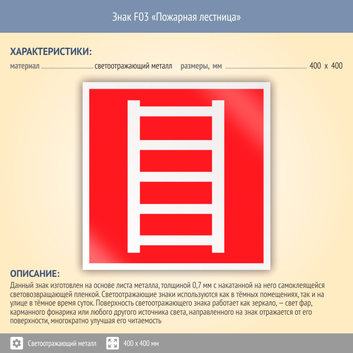 Знак F03 «Пожарная лестница» (светоотражающий металл, 400х400 мм) в Кашире купить