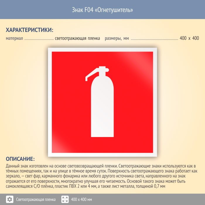 Знак F04 «Огнетушитель» (светоотражающая пленка, 400х400 мм) в Кашире купить