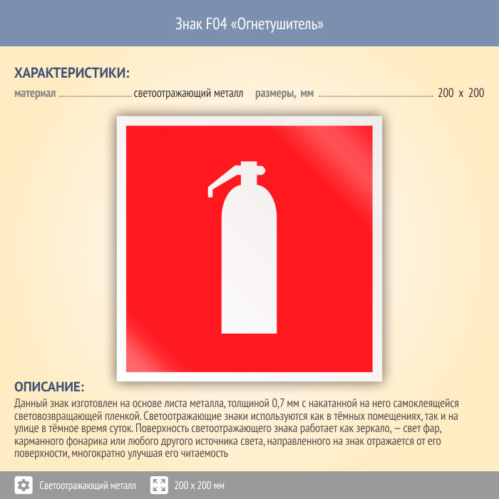 Знак F04 «Огнетушитель» (светоотражающий металл, 200х200 мм) в Кашире купить