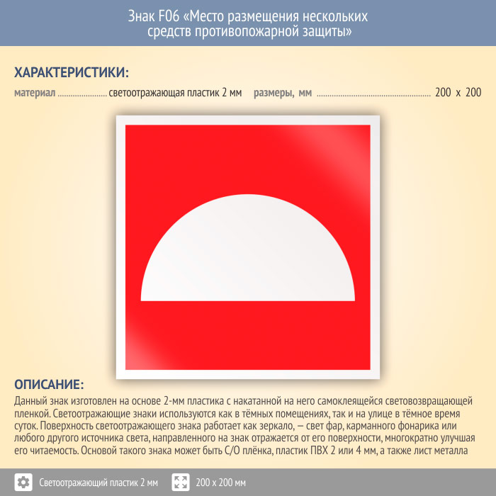 Знак F06 «Место размещения нескольких средств противопожарной защиты» (светоотражающий пластик, 200х200 мм) в Кашире купить