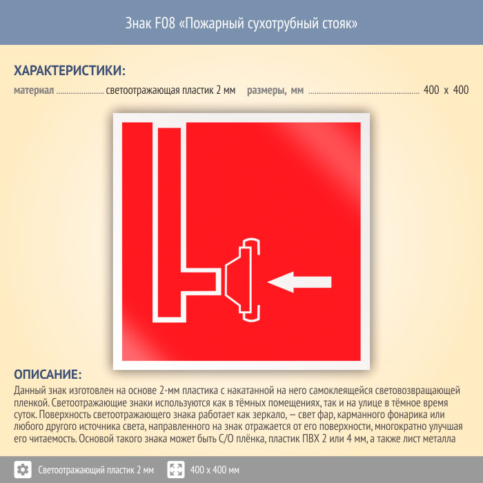 Знак F08 «Пожарный сухотрубный стояк» (светоотражающий пластик, 400х400 мм) в Кашире купить