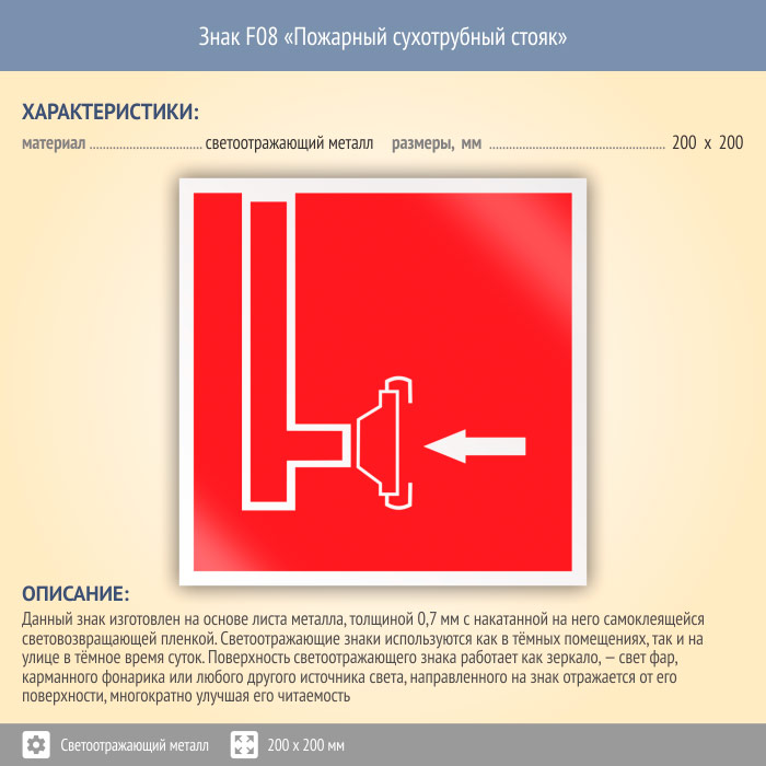 Знак F08 «Пожарный сухотрубный стояк» (светоотражающий металл, 200х200 мм) в Кашире купить