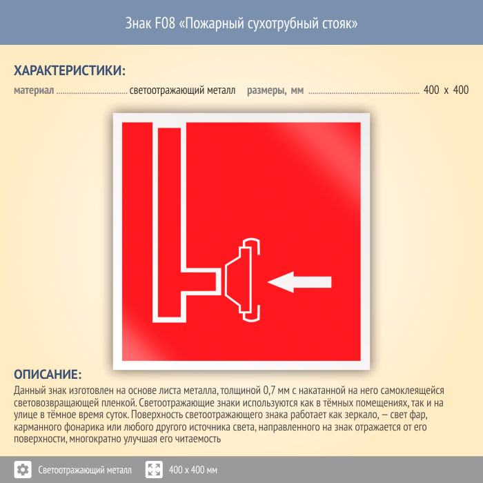 Знак F08 «Пожарный сухотрубный стояк» (светоотражающий металл, 400х400 мм) в Кашире купить