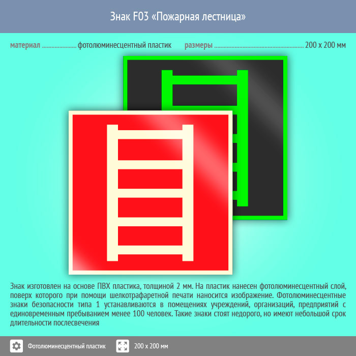 Знак F03 «Пожарная лестница» (фотолюминесцентный пластик, 200х200 мм) в Кашире купить