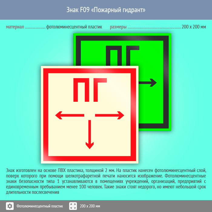 Знак F09 «Пожарный гидрант» (фотолюминесцентный пластик, 200х200 мм) в Кашире купить