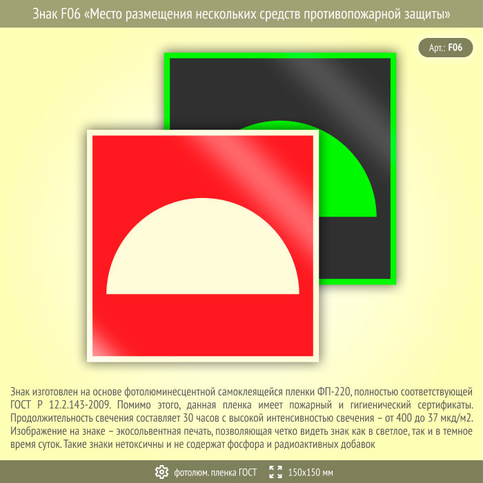 Знак F06 «Место размещения нескольких средств противопожарной защиты» (фотолюминесцентная пленка ГОСТ 34428-2018, 150х150 мм) в Кашире купить