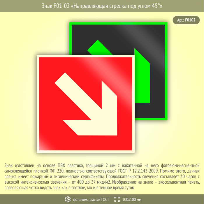 Знак F01-02 «Направляющая стрелка под углом 45°» (фотолюминесцентный пластик ГОСТ 34428-2018, 100х100 мм) в Кашире купить