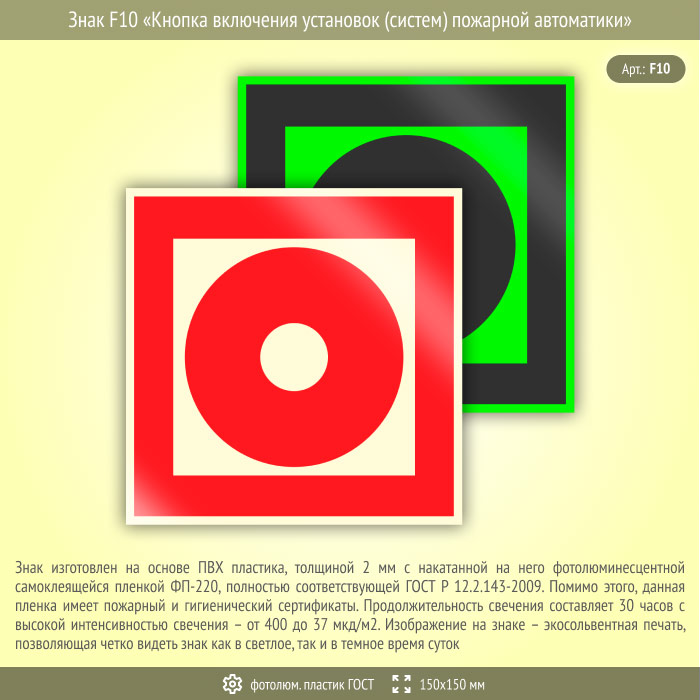 Знак F10 «Кнопка включения установок (систем) пожарной автоматики» (фотолюминесцентный пластик ГОСТ 34428-2018, 150х150 мм) в Кашире купить