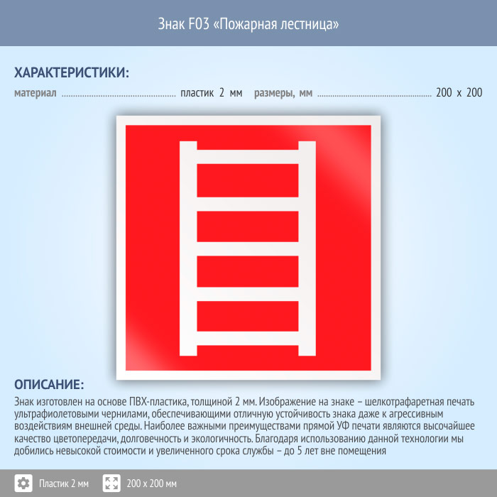 Знак F03 «Пожарная лестница» (пластик, 200х200 мм) в Кашире купить