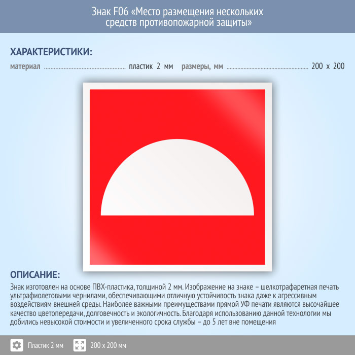 Знак F06 «Место размещения нескольких средств противопожарной защиты» (пластик, 200х200 мм) в Кашире купить