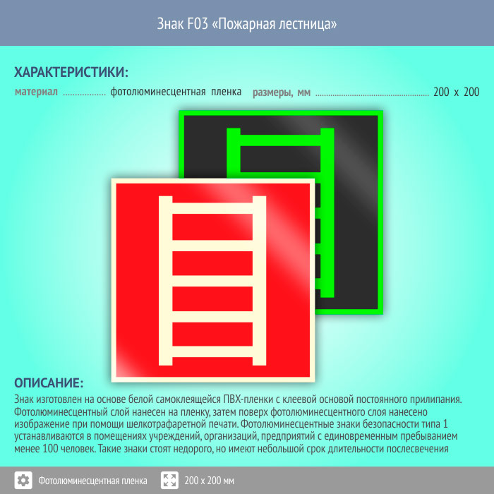 Знак F03 «Пожарная лестница» (фотолюминесцентная пленка, 200х200 мм) в Кашире купить