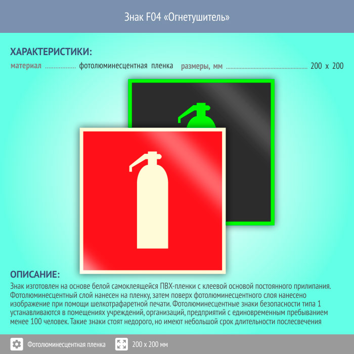 Знак F04 «Огнетушитель» (фотолюминесцентная пленка, 200х200 мм) в Кашире купить