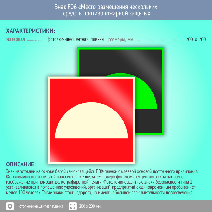 Знак F06 «Место размещения нескольких средств противопожарной защиты» (фотолюминесцентная пленка, 200х200 мм) в Кашире купить