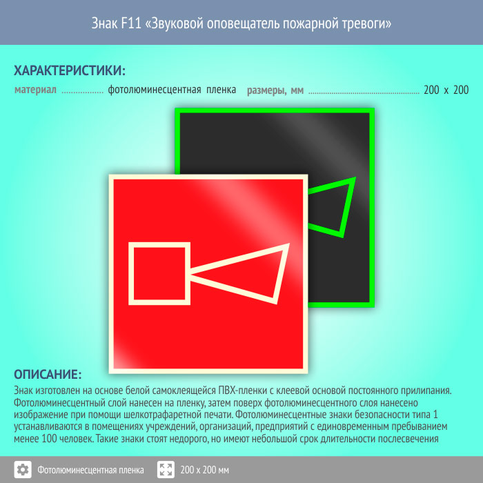 Знак F11 «Звуковой оповещатель пожарной тревоги» (фотолюминесцентная пленка, 200х200 мм) в Кашире купить