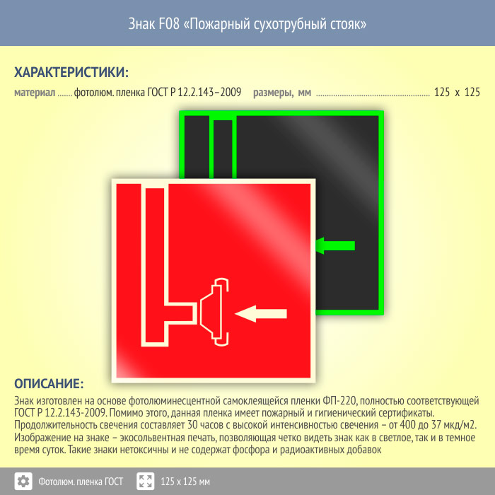 Знак F08 «Пожарный сухотрубный стояк» (фотолюминесцентная пленка ГОСТ 34428-2018, 125х125 мм) в Кашире купить
