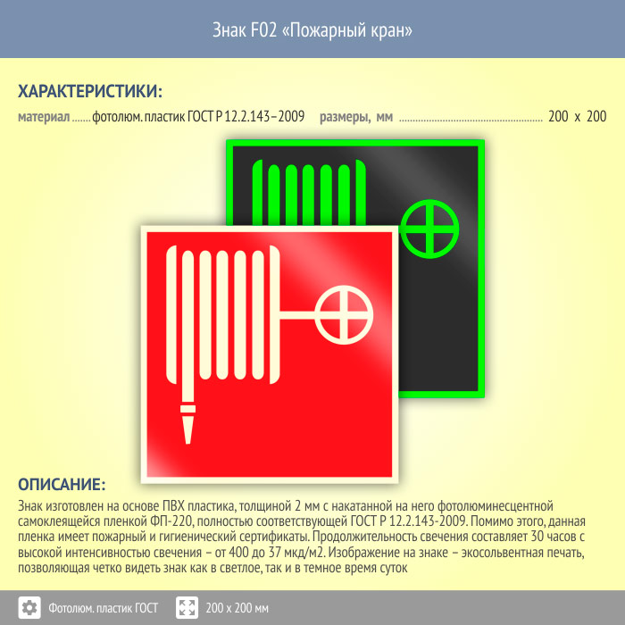 Знак F02 «Пожарный кран» (фотолюминесцентный пластик ГОСТ 34428-2018, 200х200 мм) в Кашире купить