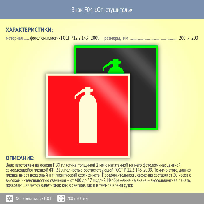 Знак F04 «Огнетушитель» (фотолюминесцентный пластик ГОСТ 34428-2018, 200х200 мм) в Кашире купить