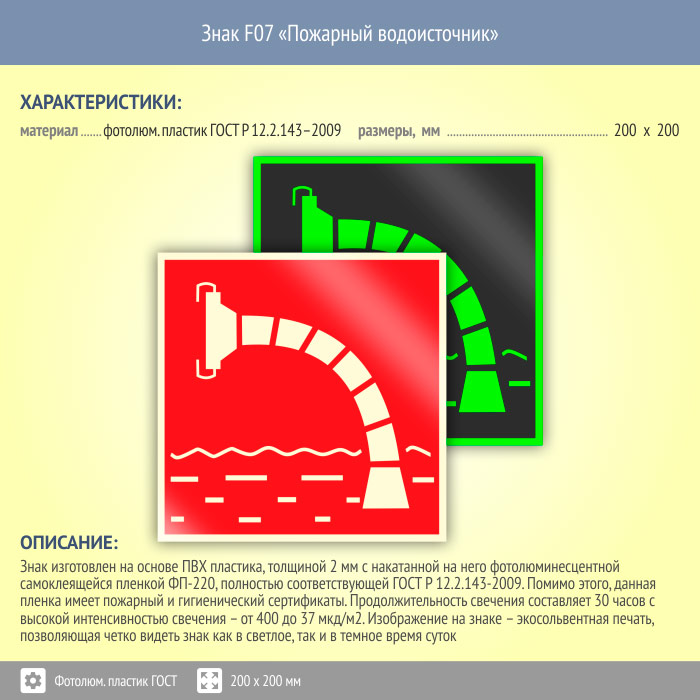 Знак F07 «Пожарный водоисточник» (фотолюминесцентный пластик ГОСТ 34428-2018, 200х200 мм) в Кашире купить