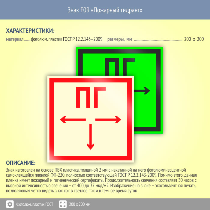 Знак F09 «Пожарный гидрант» (фотолюминесцентный пластик ГОСТ 34428-2018, 200х200 мм) в Кашире купить