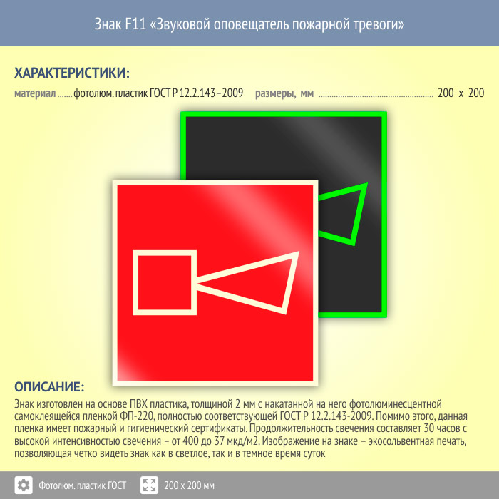 Знак F11 «Звуковой оповещатель пожарной тревоги» (фотолюминесцентный пластик ГОСТ 34428-2018, 200х200 мм) в Кашире купить